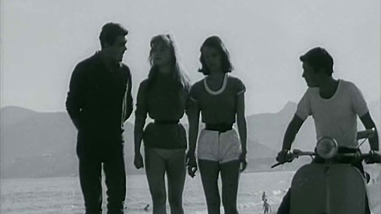 The story of two seventeen year old boys. They are wearing medals around their necks. They have their pockets full of chewing gum something that they chew ceaselessly. They are wearing blue jeans. They spend the day along the beach front in Cannes looking for girls to win over.