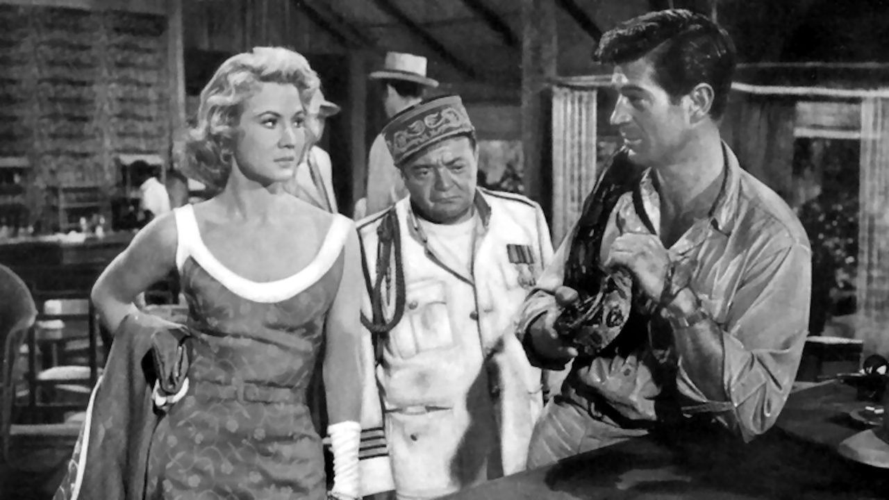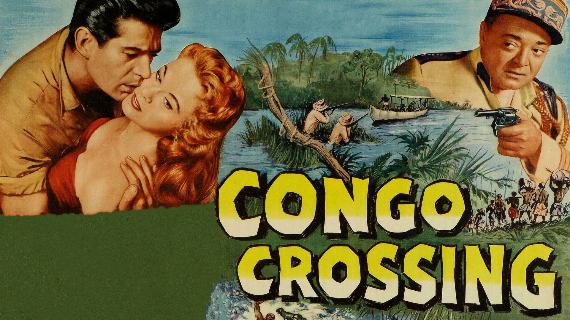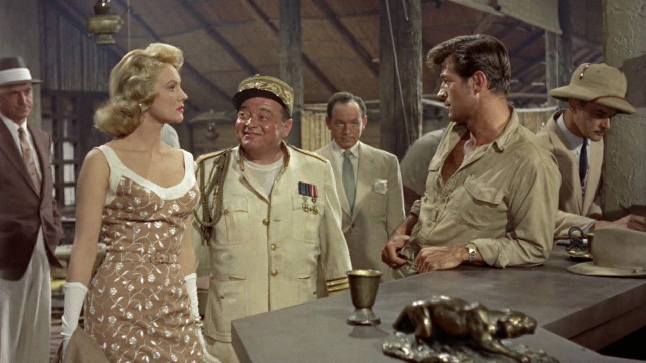 Congotanga, West Africa, has no extradition laws; the government is controlled by foreign gangsters, headed by Carl Rittner. The latest plane from Europe carries lovely Louise Whitman, fleeing a French murder charge, and Mannering, who pays resident hit man O’Connell to kill her. Through a chain of circumstances Louise, O’Connell, and heroic surveyor David Carr end up alone in the jungle on Carr’s mission to determine the true border of Congotanga… in which Rittner is keenly interested.
