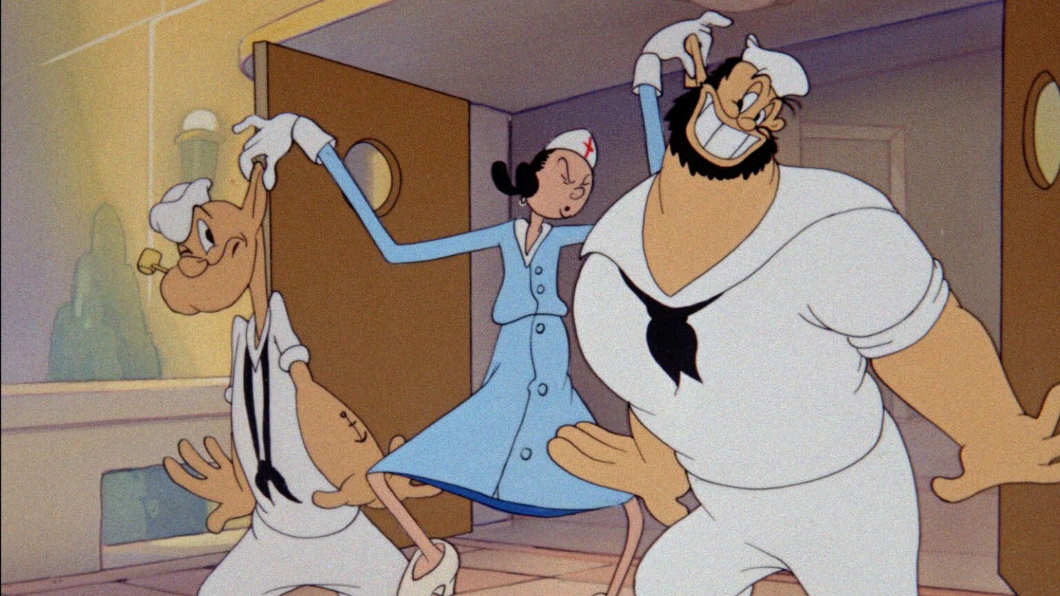 The boys see lovely nurse Olive pass by and follow her to her hospital. She throws them out, so they scheme to hurt themselves enough to get hospitalized, with no luck. Bluto gets a wall to fall on him, but stands in the window. Popeye tries to get run over by a steam-roller, but a street cleaner saves him. Bluto dives off a skyscraper – into a huge pile of mattresses. Popeye stands in a naval gunnery range, but the gunners miss the target. Bluto taunts a bull, but stands next to a billboard of an attractive cow, which distracts the bull. Popeye crashes a plane, but the ambulance crew rescues the plane. The boys compete to get run over by a train, but punch each other off the tracks just as the train arrives. Finally, Popeye forces a can of spinach down Bluto’s throat and gets a pounding. That lands him in the hospital but not Olive’s; they failed to notice the sign: “Cat and Dog Hospital.” They start fighting like cats and dogs, and get hauled off to the looney bin.