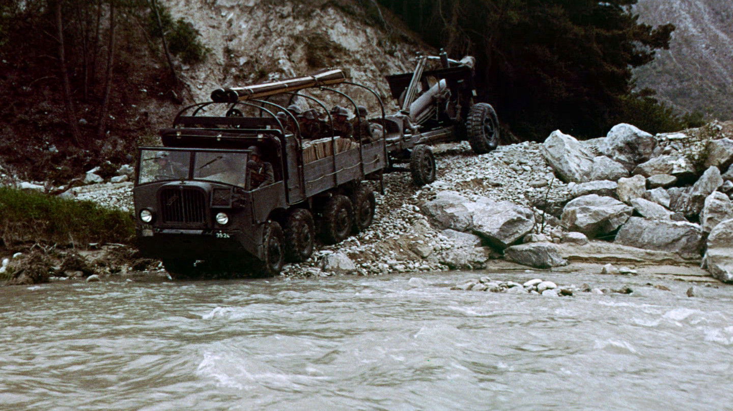 Wehrhafte Schweiz is a Swiss Army propaganda film, made for the Expo 64 national exhibition in the then-prevailing spirit of geistige Landesverteidigung, “cultural national defense”. It portrays the Swiss Army fighting against an unnamed, unseen enemy, using heavy weapons such as flamethrowers, artillery, tanks and bomber aircraft. After the enemy is repelled, the film closes with idyllic shots of beautiful Swiss landscapes. The 20-minute film was shot using the latest action film techniques in the Cinerama format on expensive MCS-70 Super Panorama 70mm stock. (Wikipedia)