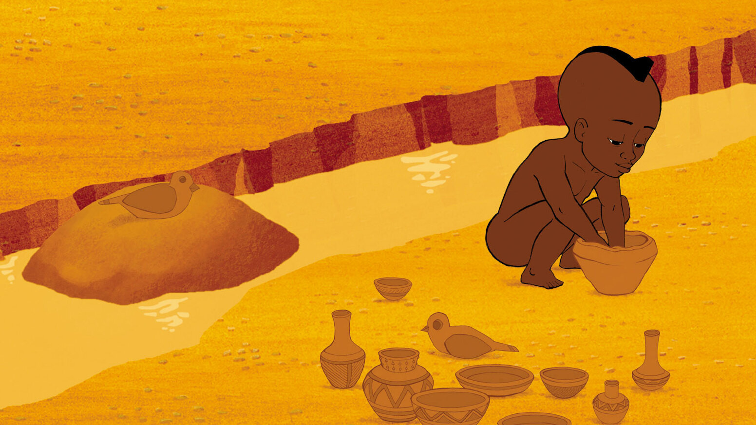 Kirikou’s Grandfather says that the story of Kirikou and The Witch was too short, so he proceeds to explain more about Kirikou’s accomplishments. We find out how little boy became a gardener, a detective, a maker of pottery, a merchant, a traveler and a doctor.