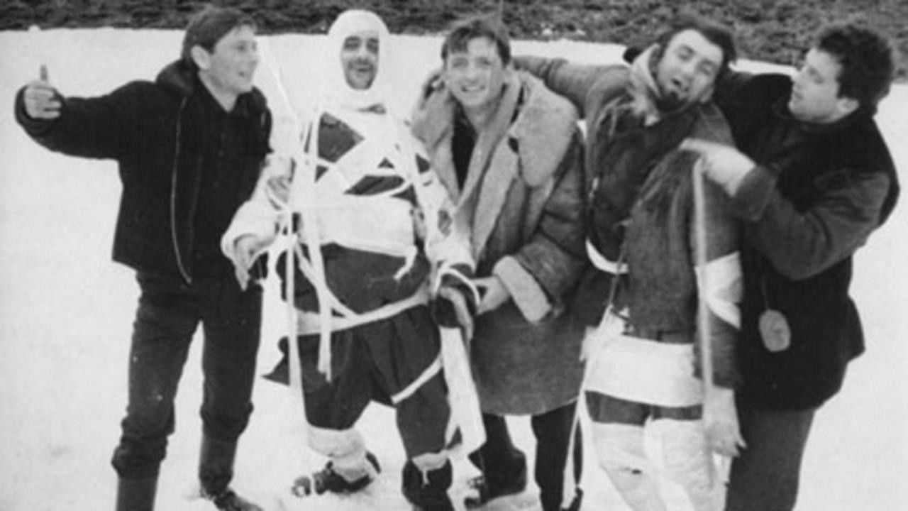 “Waiting for Godot” on ice and snow, without words. Against a barren winter landscape, a figure approaches: it’s a man, pulling a small sleigh on which another man sits, plucking a dead bird. They stop to trade places; the one now on the sleigh takes out his knitting. Accidents, misunderstandings, disagreements, and an outright fight await our absurd protagonists as their trip to nowhere continues, first with one pulling, then the other. What if they were to lose the sleigh? What rules of civilization and partnership would guide them then?