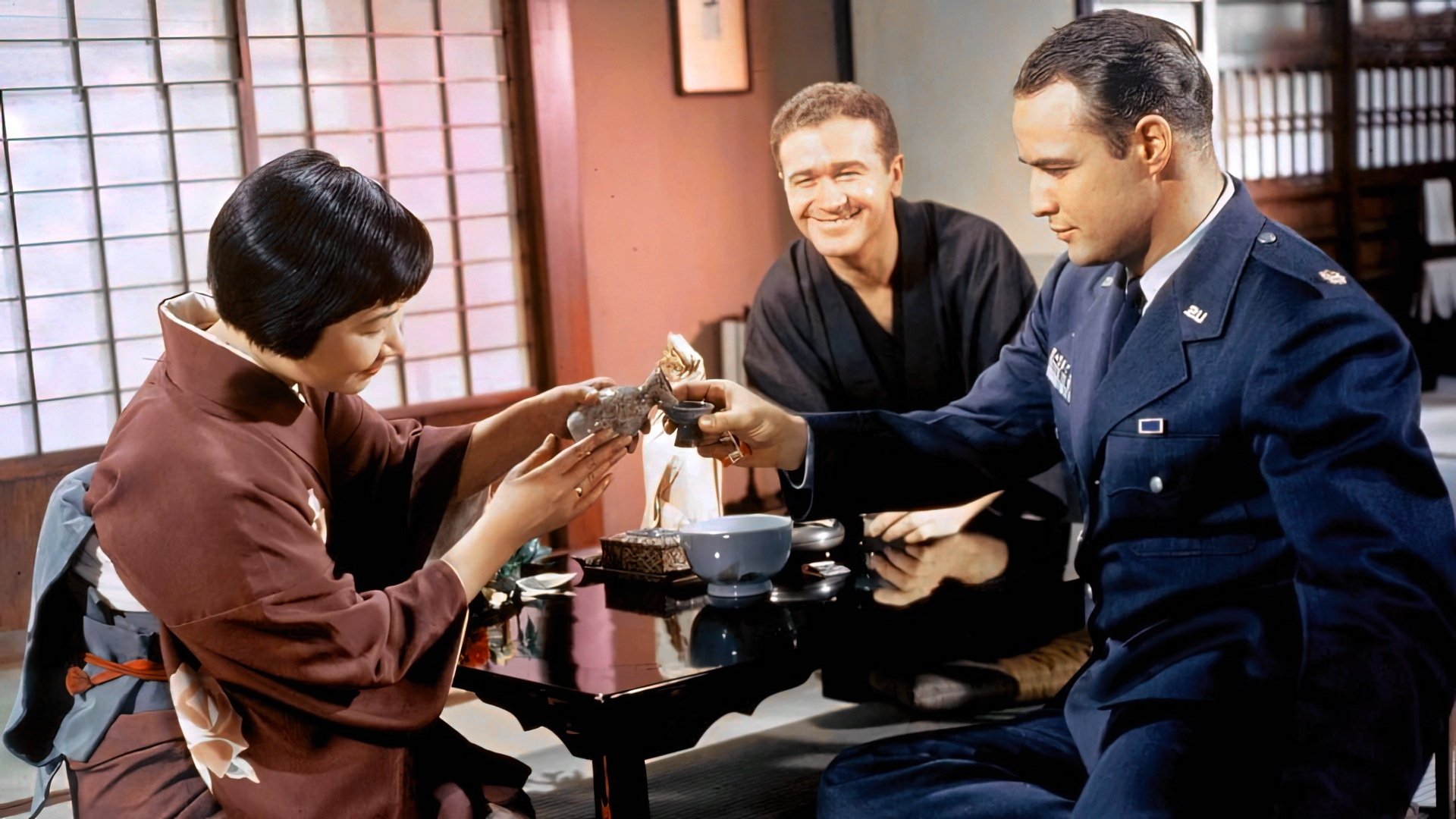 Air Force Major Lloyd Gruver is reassigned to a Japanese air base and is confronted with US racial prejudice against the Japanese people. The issue is compounded because a number of the soldiers become romantically involved with Japanese women, in defiance of US military policy. Ordinarily, a by-the-book officer, Gruver must take a position when a buddy of his, an enlisted man, Joe Kelly, falls in love with a Japanese woman, Katsumi, and marries her. Gruver risks his position by serving as best man at the wedding ceremony.