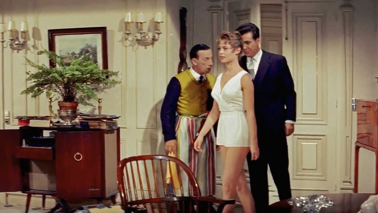 Nightclub entertainer Jean Clery has just become engaged to Lili, his attractive psychoanalyst. Meanwhile, the nightclub where he works is being used by a counterfeit ring, and Paris police suspect owner Paul Latour of being the ringleader. Finding it expedient to leave town, Paul leaves his “baby” daughter with Jean…who discovers too late that she’s a wild, carefree, shapely sex-kitten with a talent for getting Jean into amusing scrapes.