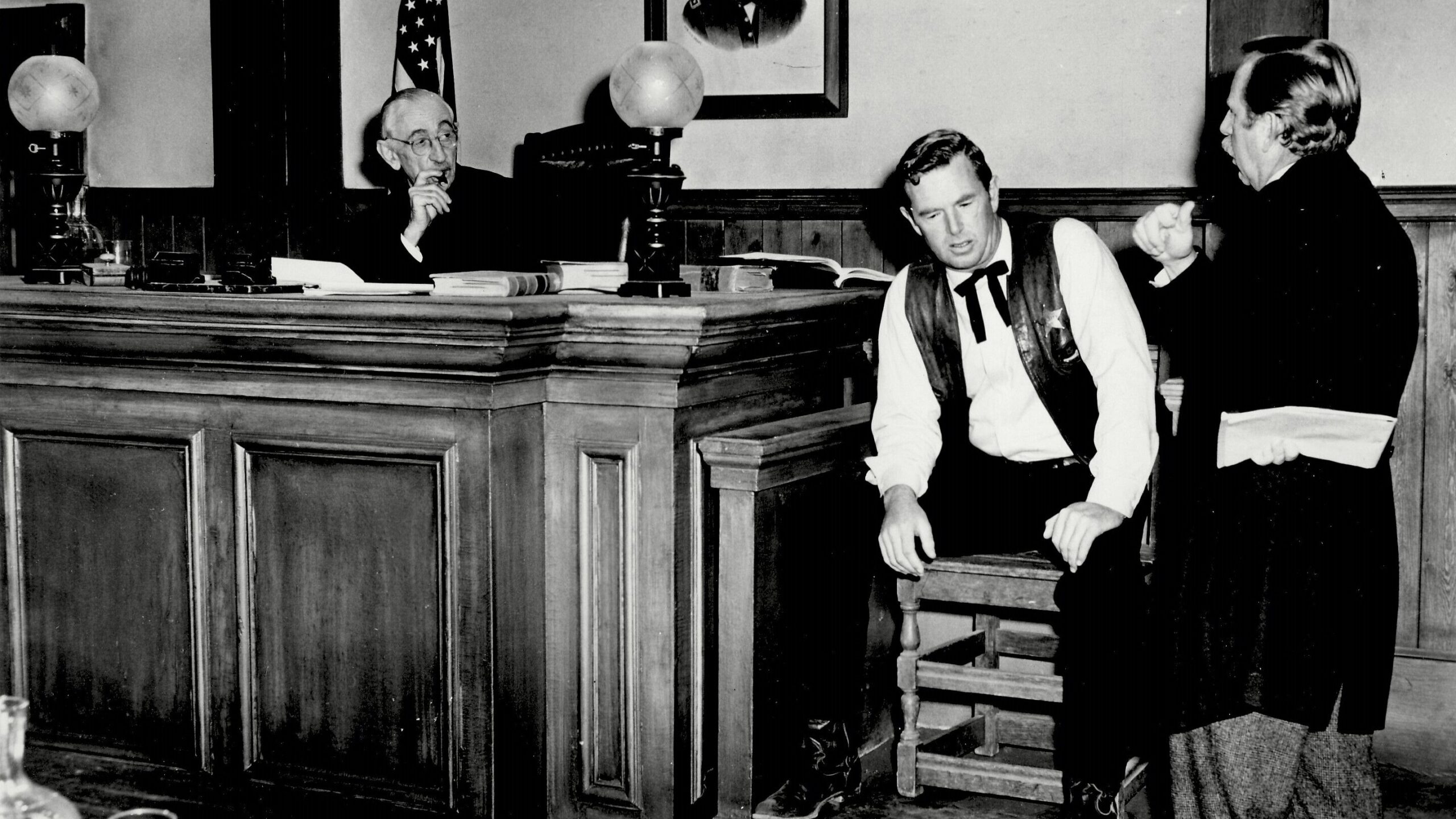 Frontier peacekeeper Sheriff Galt faces a crisis of conscience in The Iron Sheriff. In the aftermath of a robbery-murder, Galt follows the trail of evidence directly to his own son, Benjie. Sworn to uphold the law at all costs, Galt is grimly determined to see that Benjie will receive a fair trial without any coercion on his part. But the townsfolk have already decided that the sheriff will try to spring the boy, and a lynch-mob mentality slows festers its way through the community. As the trial proceeds, it becomes obvious that Benjie is going to hang for his alleged crime, but there’s still one or two surprises in store.