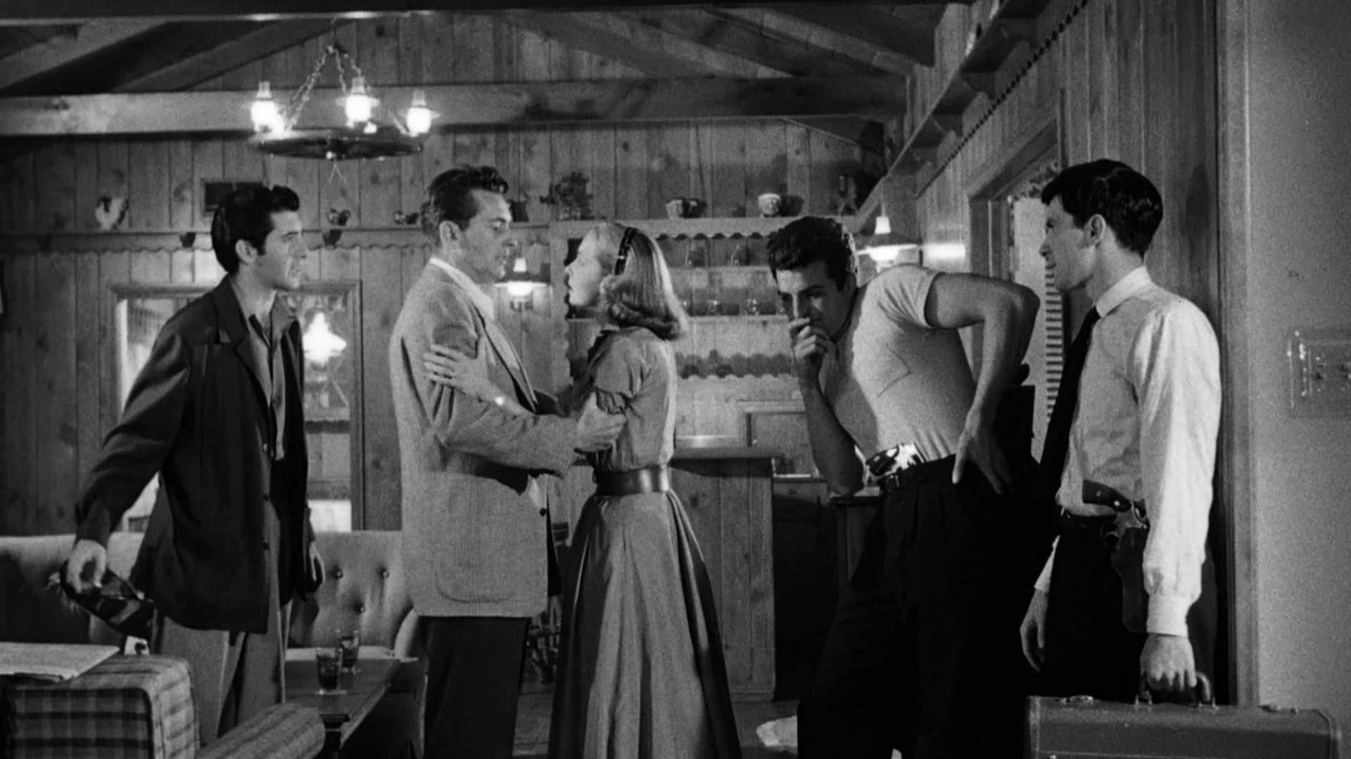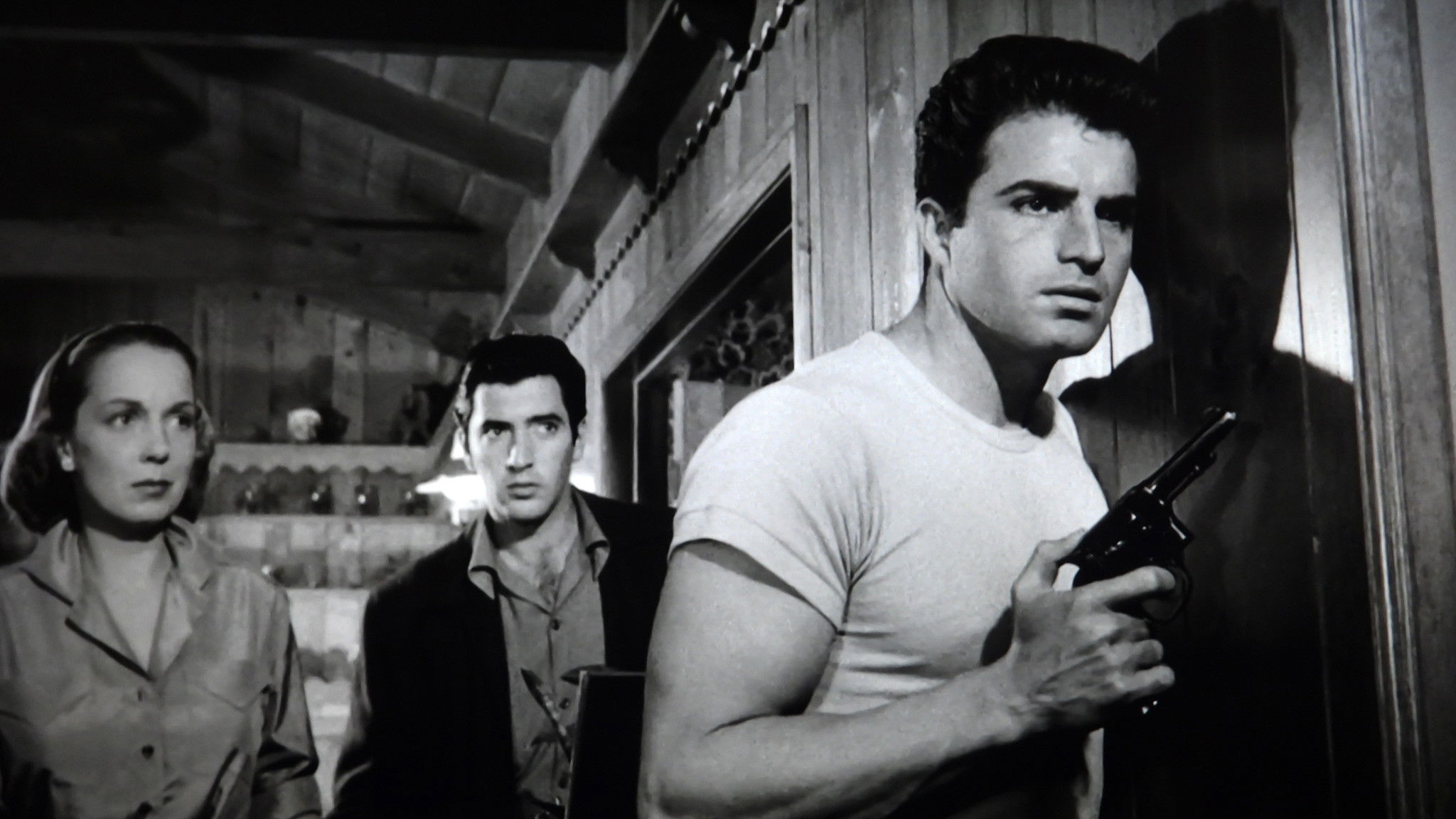 A group of escaped convicts holds a household prisoner as the police close in.