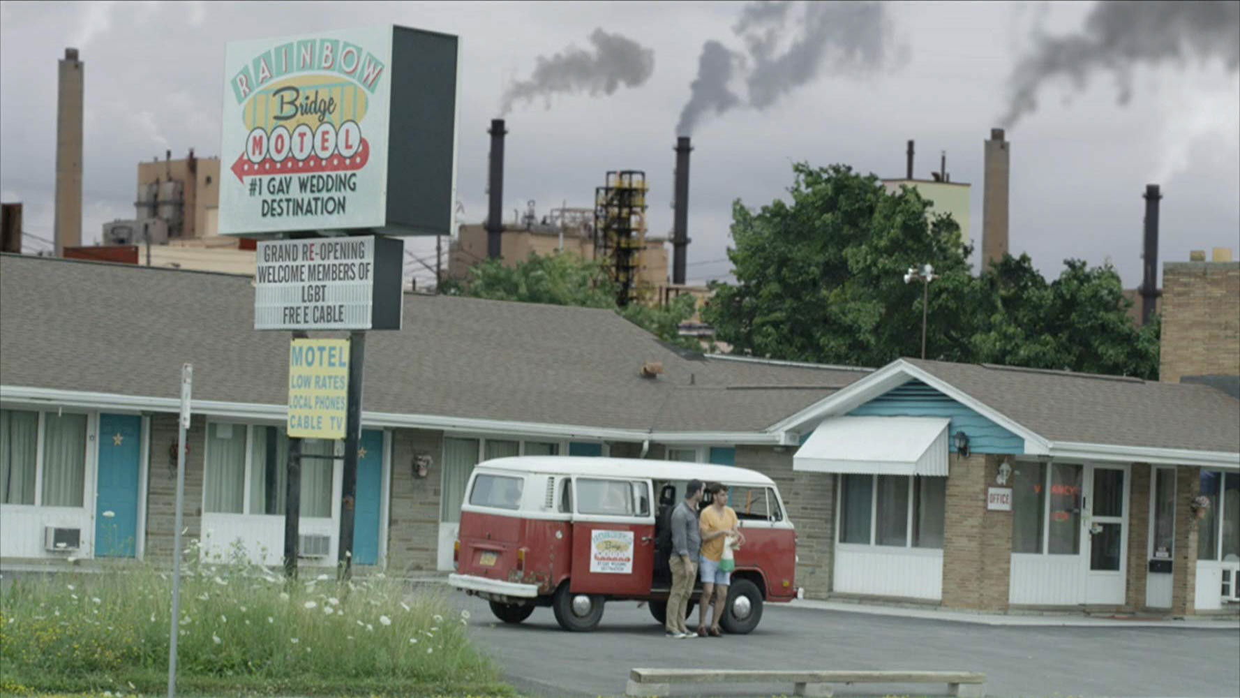 When Arizona couple Dean (Chris Modryznski) and Darren’s (Cole Burden) dream wedding in Niagara Falls doesn’t go quite as they planned, they make the most of it in a ragtag roadside motel run by a professional shyster. RENT’s Wilson Heredia, Mel Gorham, and Diane Gaidry star in Scott Rubin and J. Garrett Vorreuter’s charming, offbeat romantic comedy. A Gravitas Ventures release.