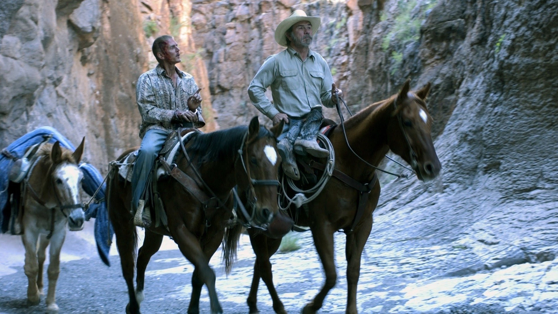 When brash Texas border officer Mike Norton wrongfully kills and buries the friend and ranch hand of Pete Perkins, the latter is reminded of a promise he made to bury his friend, Melquiades Estrada, in his Mexican home town. He kidnaps Norton and exhumes Estrada’s corpse, and the odd caravan sets out on horseback for Mexico.