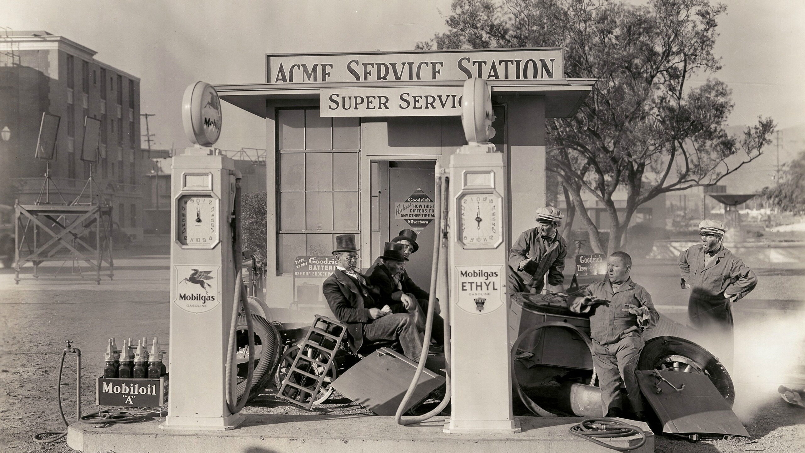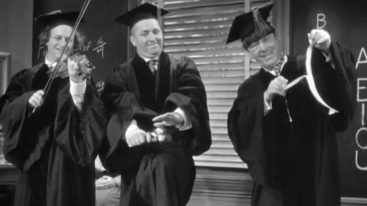 The stooges are left in charge of a gas station and manage to blow up the car of their first customers, three famous European professors. The stooges steal some of the academics’ clothes and wind up at “Mildew”, a women’s college where the three professors are expected. Mistaken as the real thing, the boys take their place on the faculty. When the real professors show up, the stooges try to convince a rich woman, the schools benefactor, that an athletics programs is more important. Their athletics demonstration comes to an explosive end when the real professors slip them a nitroglycerin basketball.