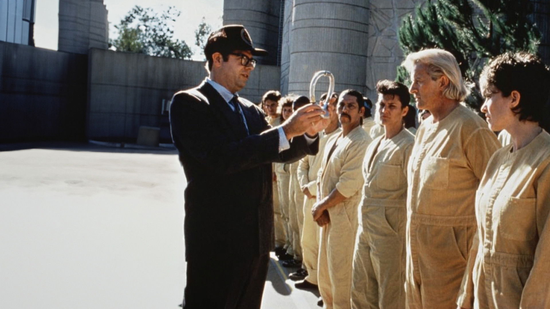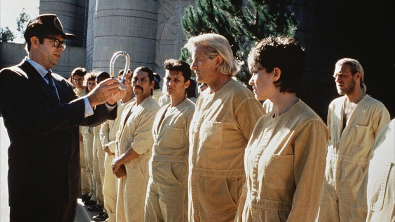 A male prison escapee heads for his hidden loot, electronically attached to a female prisoner.