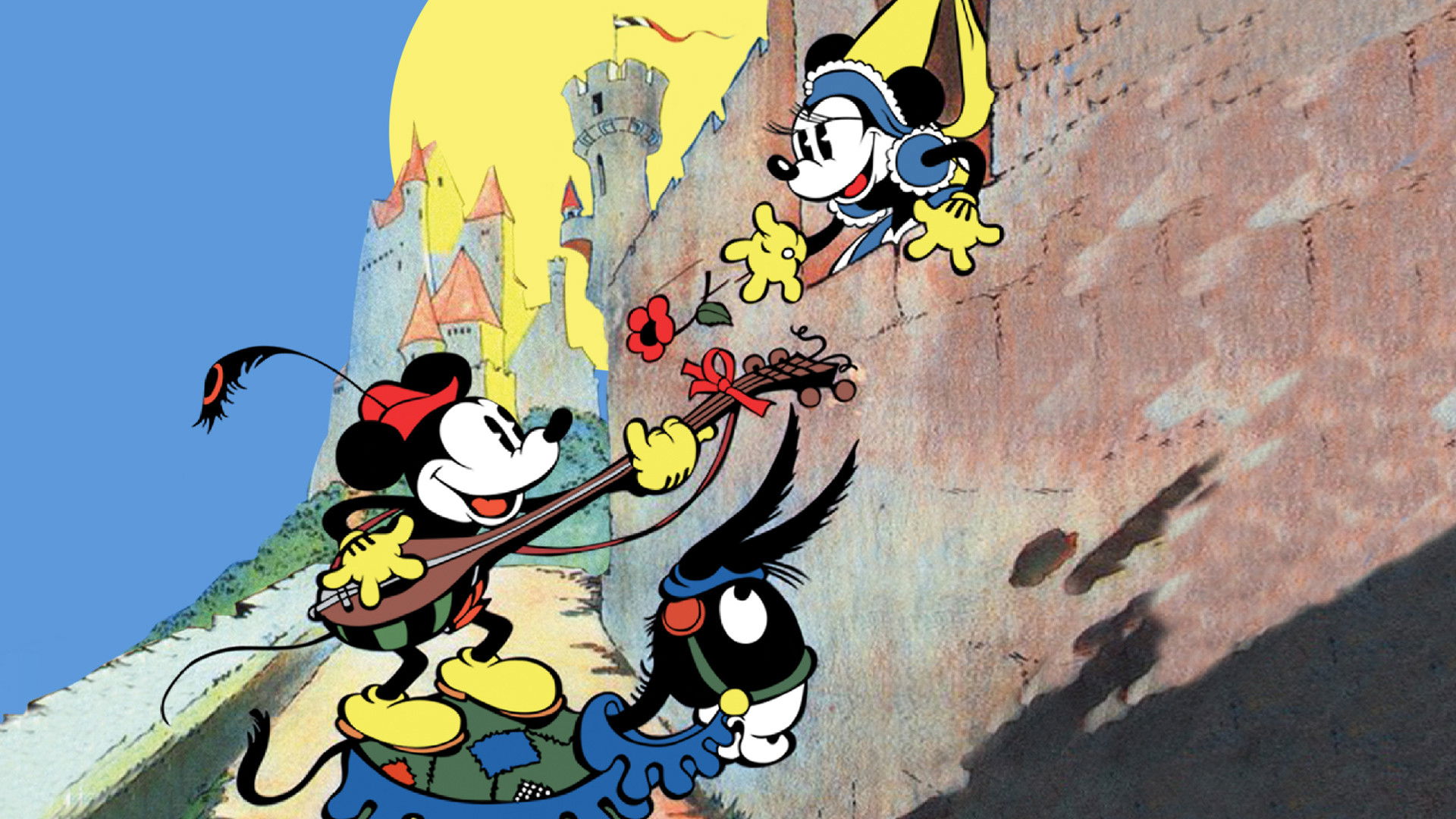 The princess is to wed the Prince against her wishes. When she refuses, the king locks her in the tower. Minstrel Mickey sees her and rescues her, making a rope from the clothes of lady-in-waiting Clarabell. The king spots them and prepares to chop off Mickey’s head until Minnie intercedes. The king calls for a joust. Mickey wins and they live happily ever after.