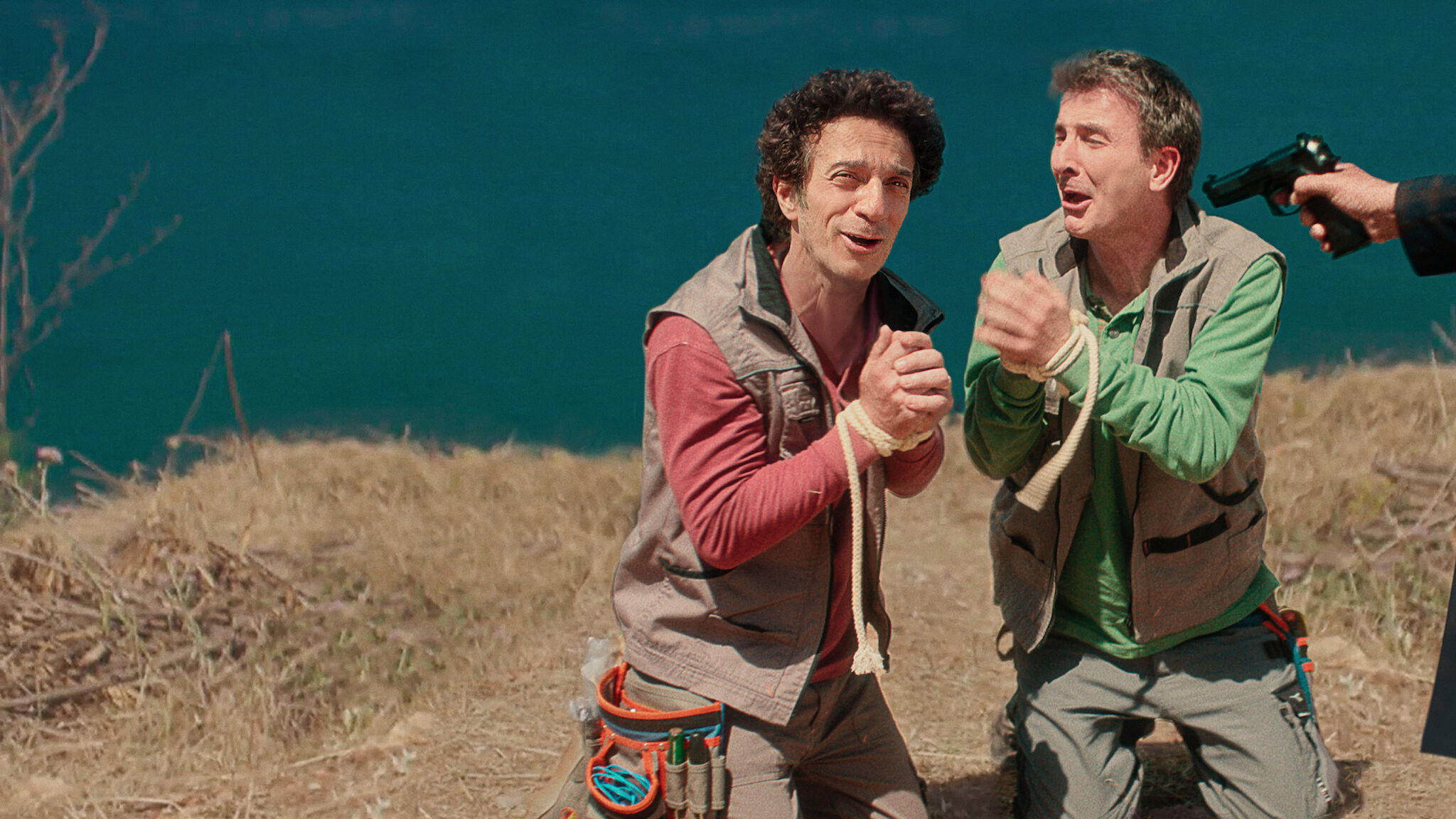 After two hapless TV technicians stumble upon a murder scene, every step they take to avoid becoming suspects lands them in deeper trouble.