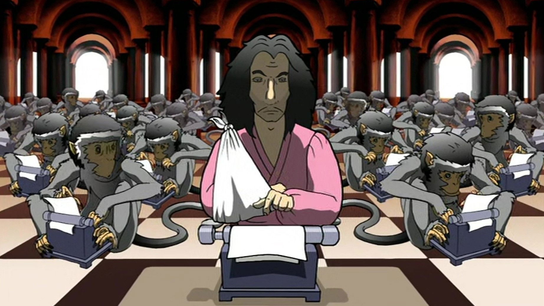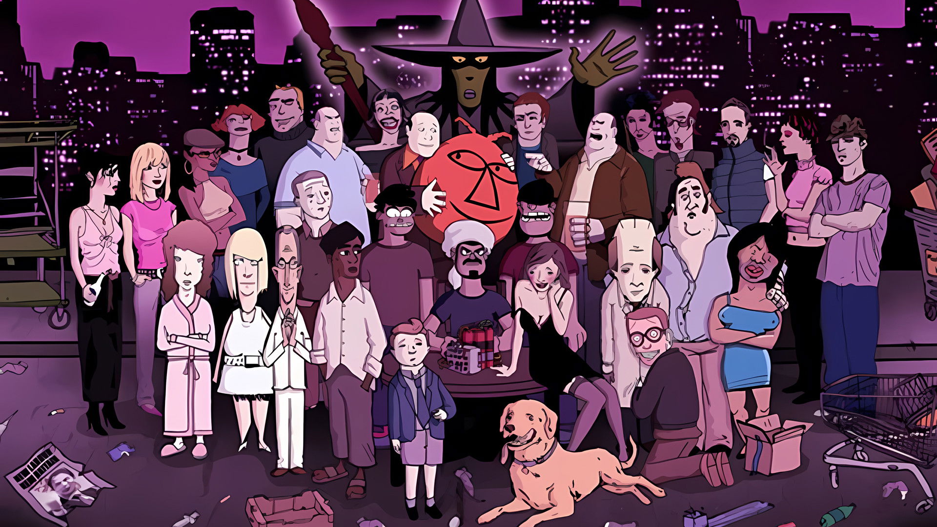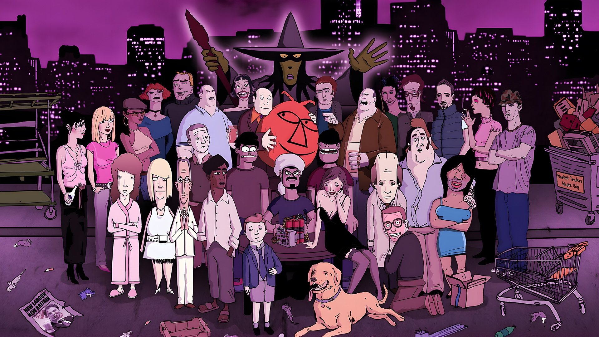Monkey Dust is a British satirical cartoon, notorious for its dark humour and handling of taboo topics such as bestiality, murder, suicide and paedophilia. There were three series broadcast on BBC Three between 2003 and 2005. Following co-creator Harry Thompson’s death, no further series were made.