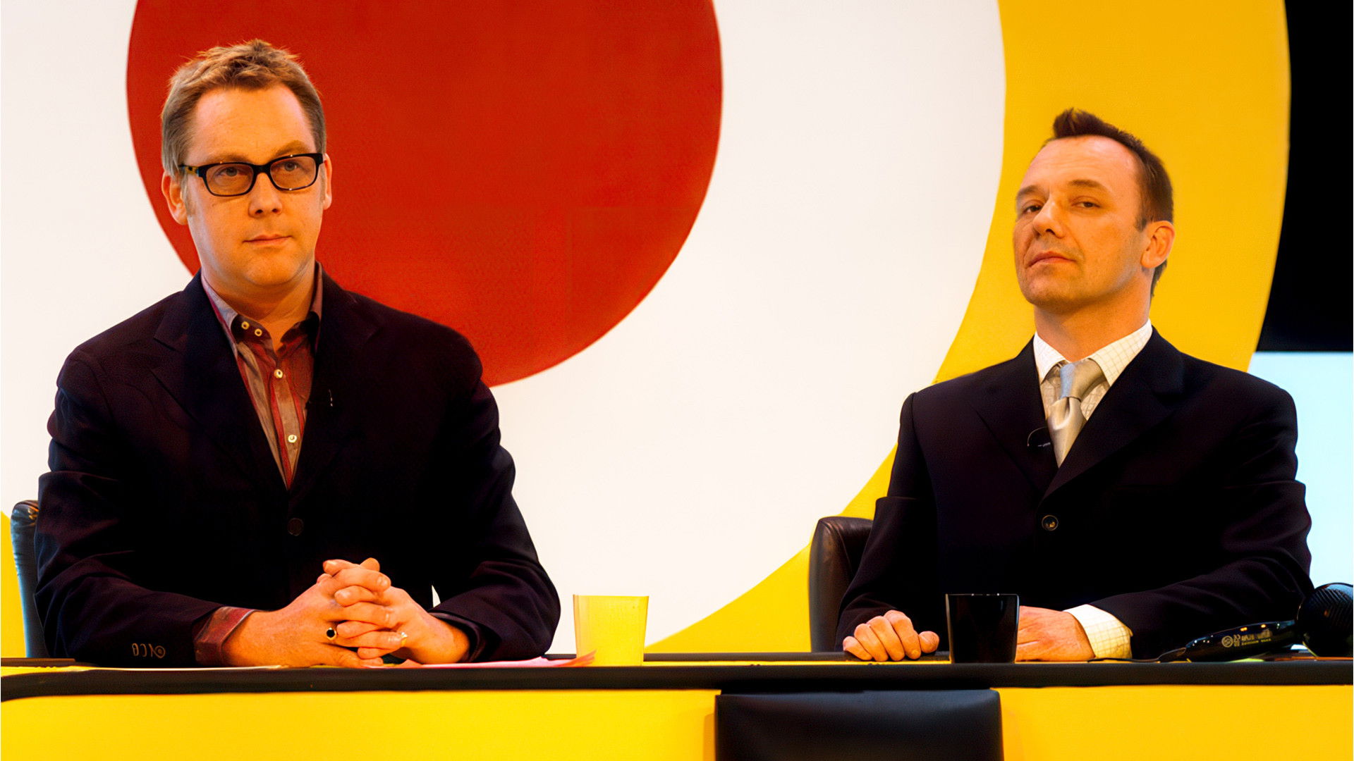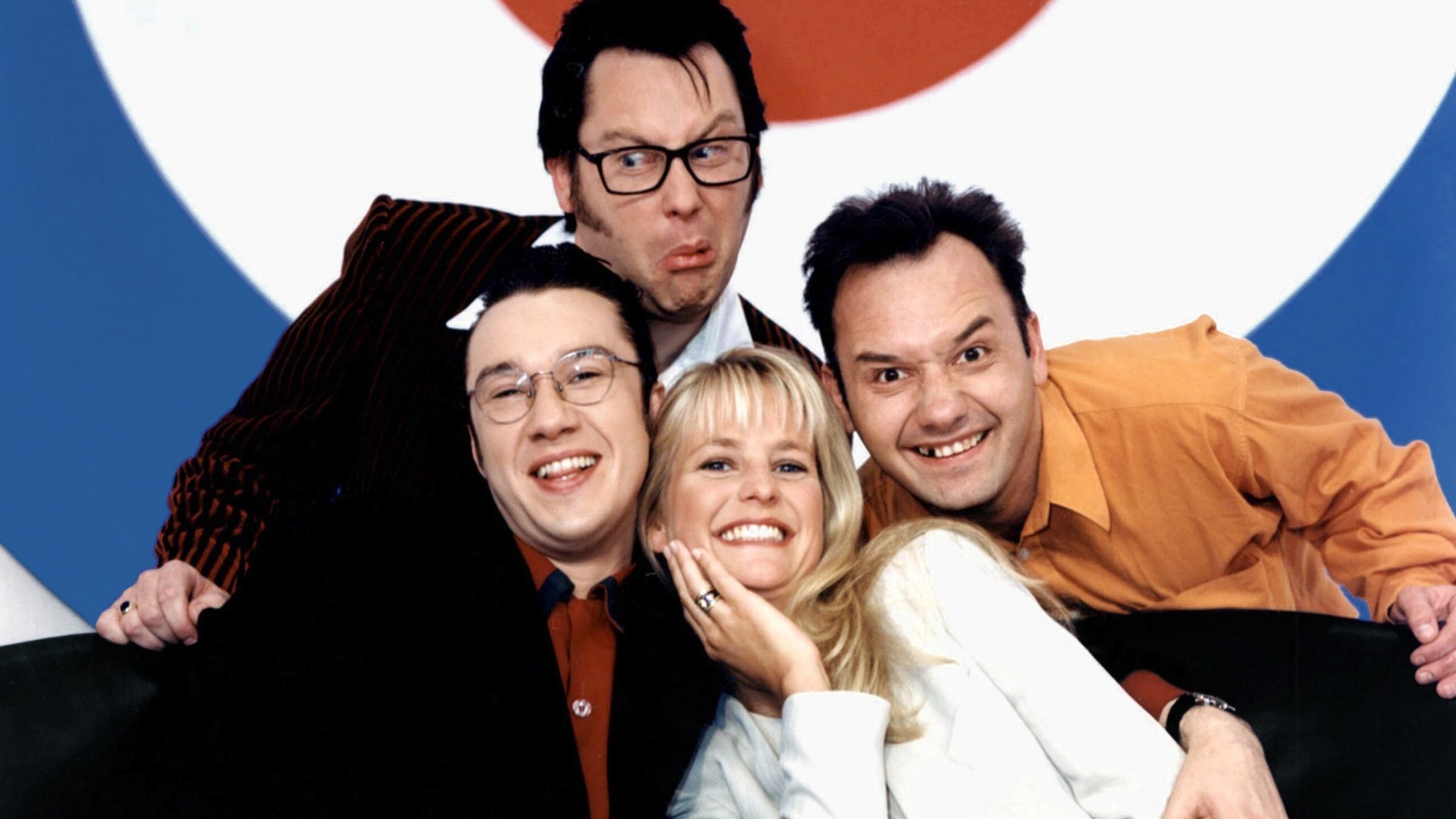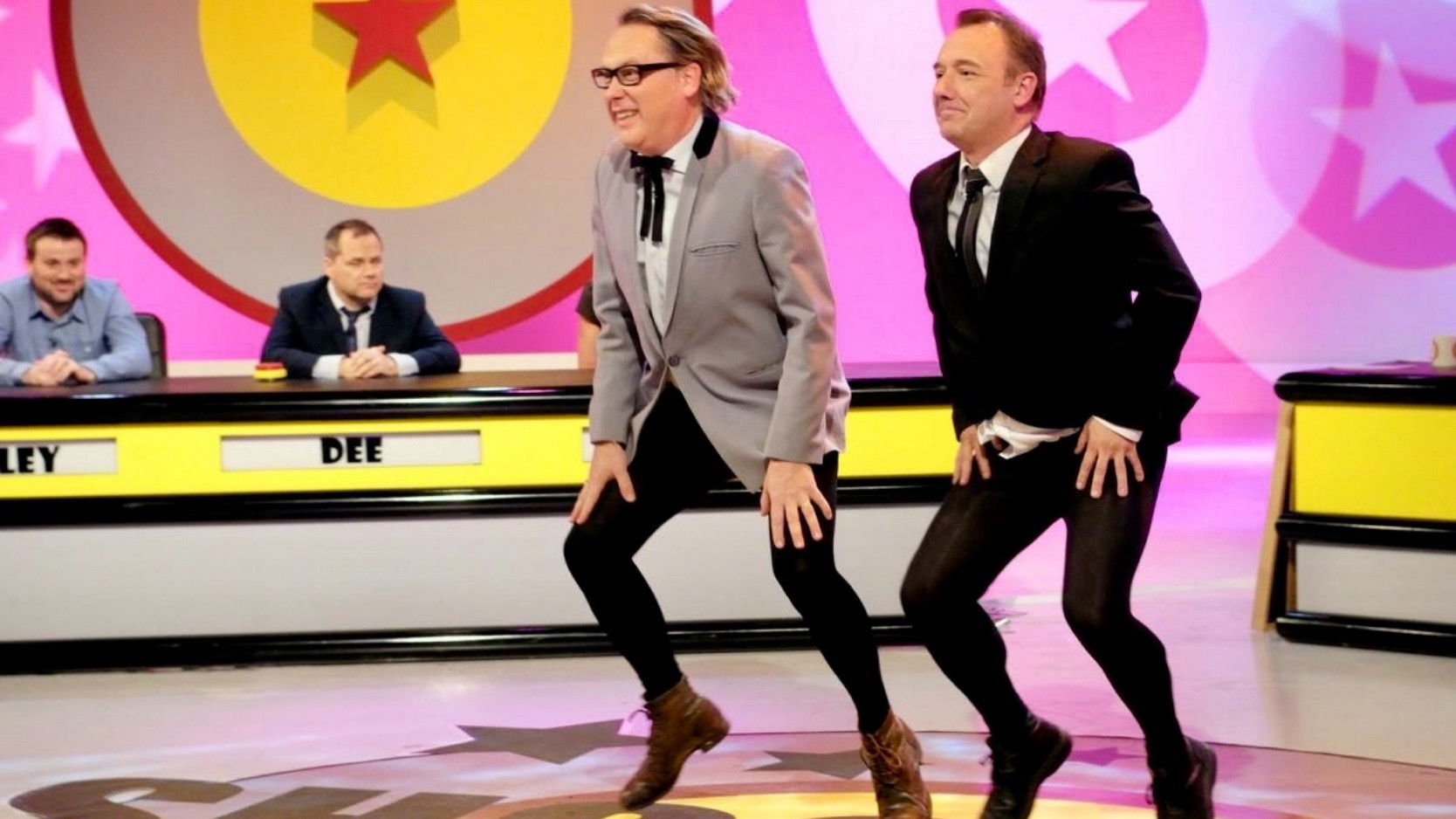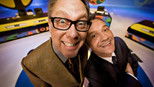 Shooting Stars is a British television comedy panel game broadcast on BBC Two as a pilot in 1993, then as 3 full series from 1995 to 1997, then on BBC Choice from January to December 2002 with 2 series before returning to BBC Two for another 3 series from 2008 until its cancellation in 2011. Created and hosted by double-act Vic Reeves and Bob Mortimer, it uses the panel show format but with the comedians’ often slapstick, surreal and anarchic humour does not rely on rules in order to function, with the pair apparently ignoring existing rules or inventing new ones as and when the mood takes them.